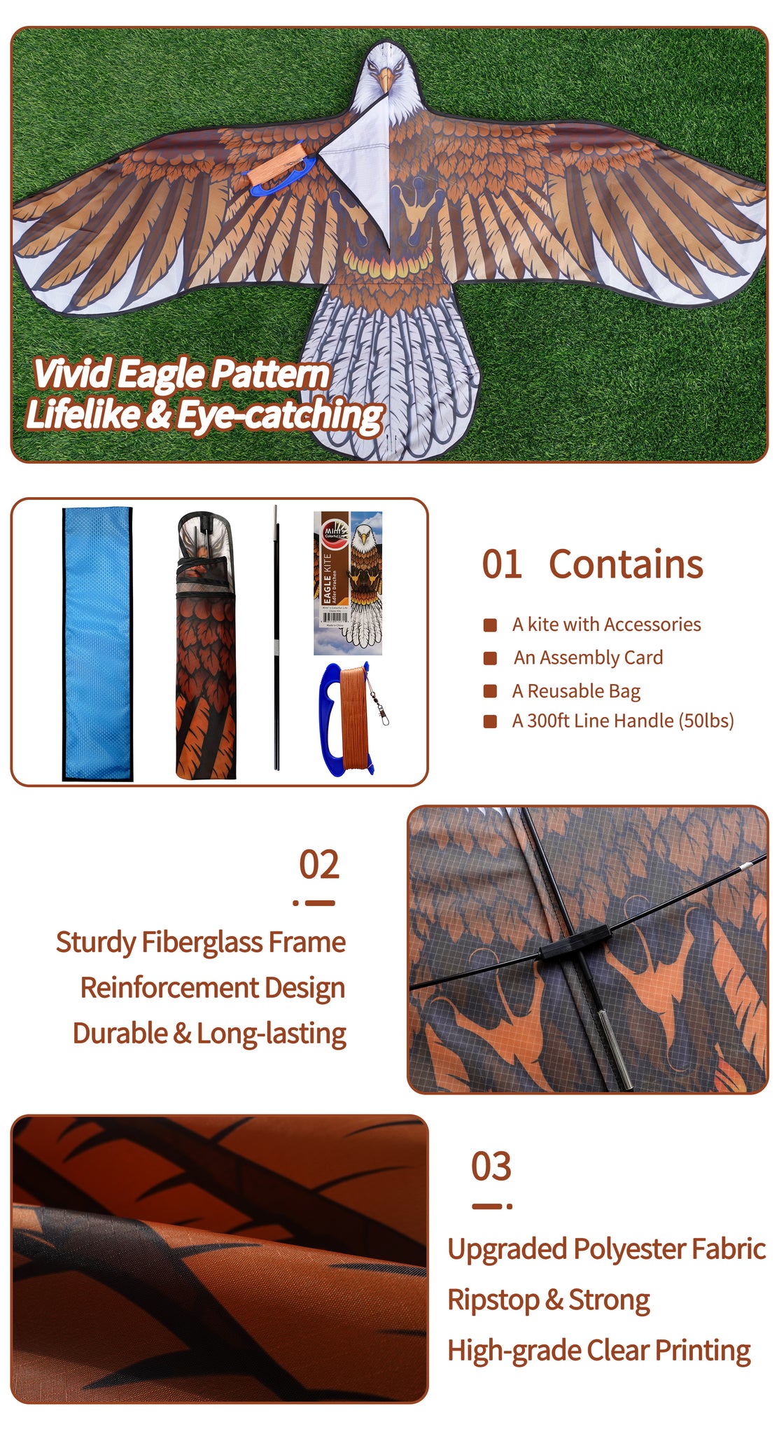 - Special for Family Beach Vacation All you need to do is to release lots of lines, and then watch this lively eagle soaring freely in the air. It can fly all day until you take it down to leave.