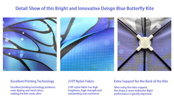 • Bright colors and innovative design. The design of this butterfly kite is inspired by the national butterfly "Goddess of Light" of Chile. The vivid and bright blue gives this butterfly its soul. When it dances in the sky, you seem to see a vivid butterfly flying in the air.
